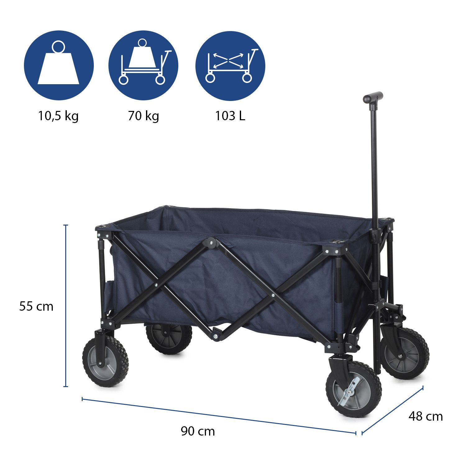 Praktický vozík vyrobený z robustního textilu o objemu 103 l a nosnosti 70 kg. Rám: práškově lakovaná ocel, složitelný do rozměru: 39 x 20 x 75 cm, rozměr v rozloženém stavu: 90,5 x 48 x 55,5 cm, váha: 10,5 kg, otočná kolečka s brzdami.
