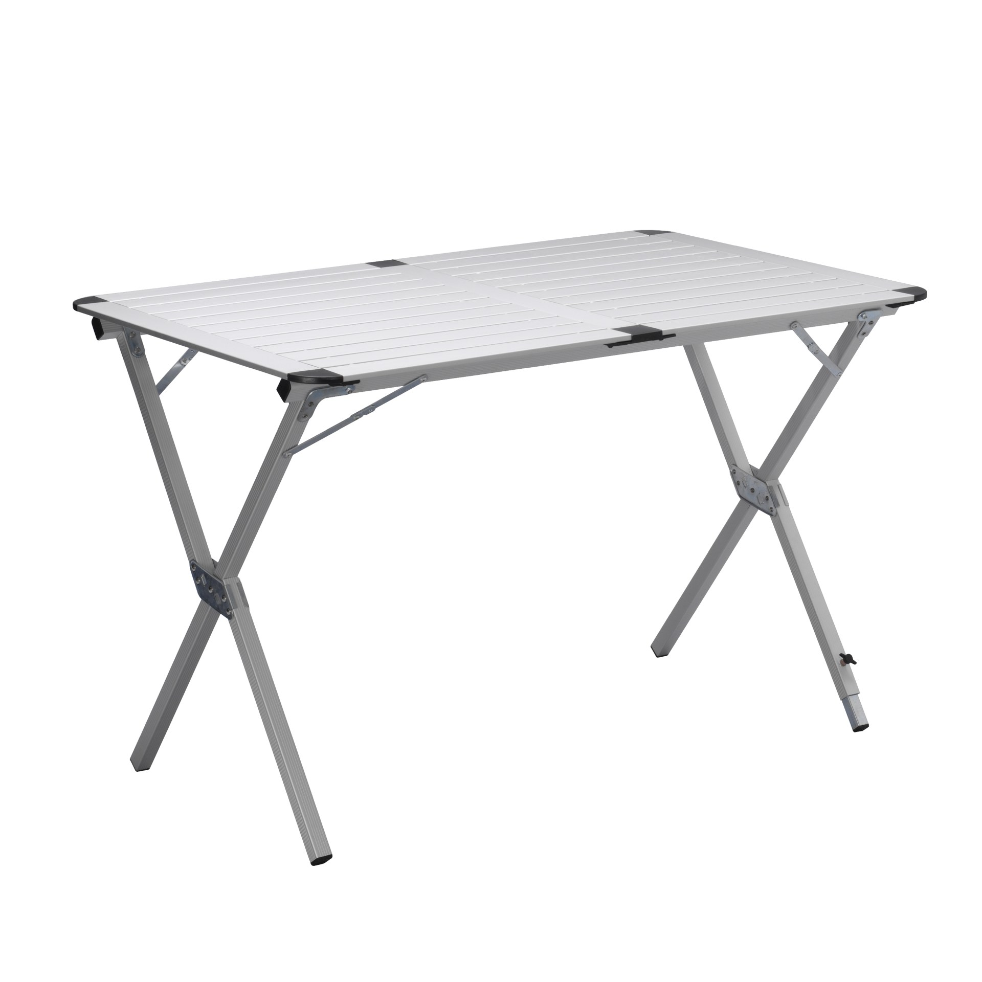 Skládací kempingový stůl s rolovací vrchní deskou - velmi praktické. Materiál rámu: hliník, materiál desky stolu je počasí odolný: hliník, výškově nastavitelné nohy stolu, praktický obal pro skladování a převoz, rozměr ve složeném stavu: 110 x 20 x 11 cm, rozměr v rozloženém stavu: 110 x 70 x 70 cm, nosnost: 30 kg. Váha stolu: 5 kg.