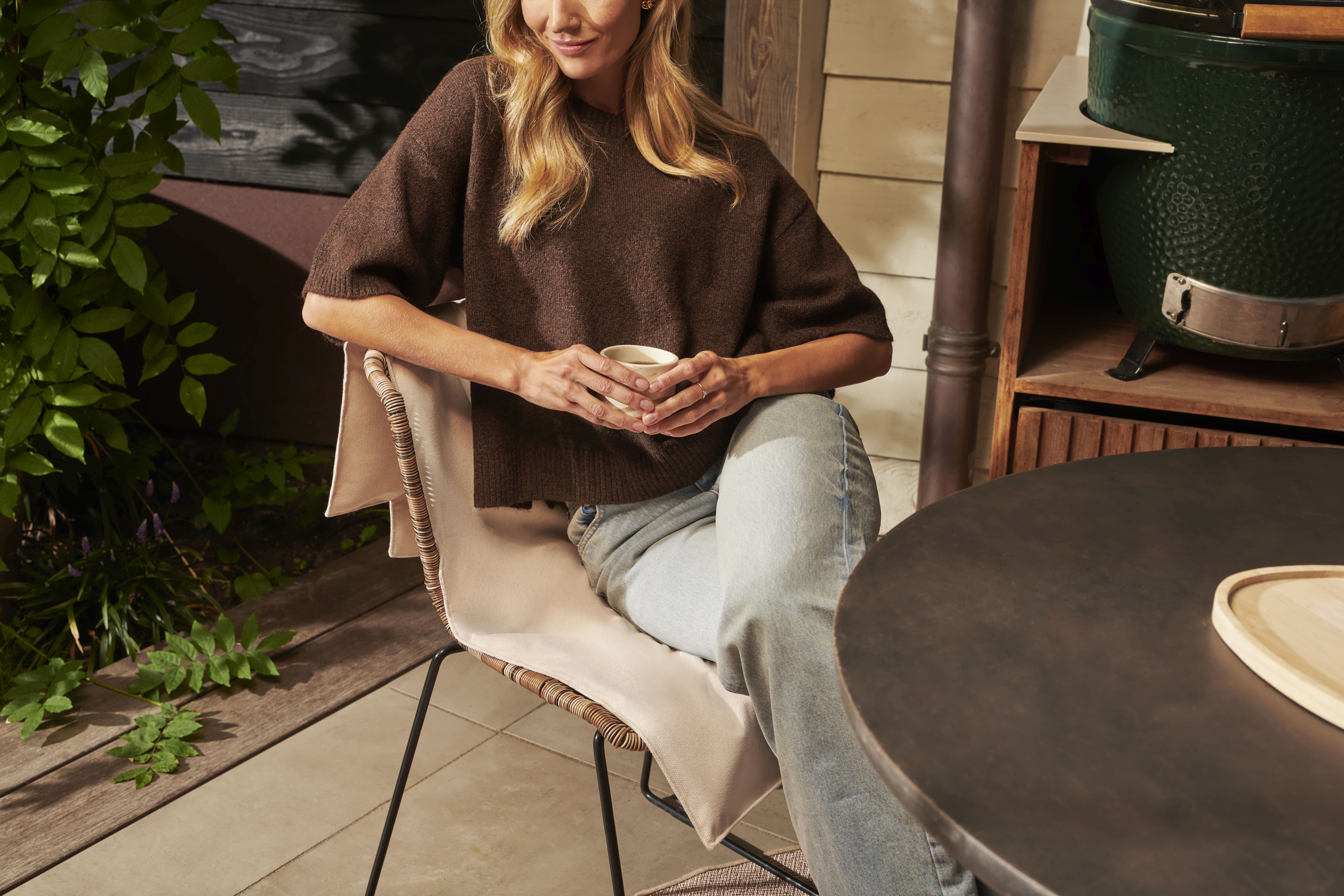 Pohodlí i venku. Mellow je díky vodoodpudivému potahu a bezdrátovému provozu ideální také pro venkovní použití. Ať už jste na chladném ránu v kempu nebo si užíváte večer na terase, zůstanete v teple bez ohledu na počasí.