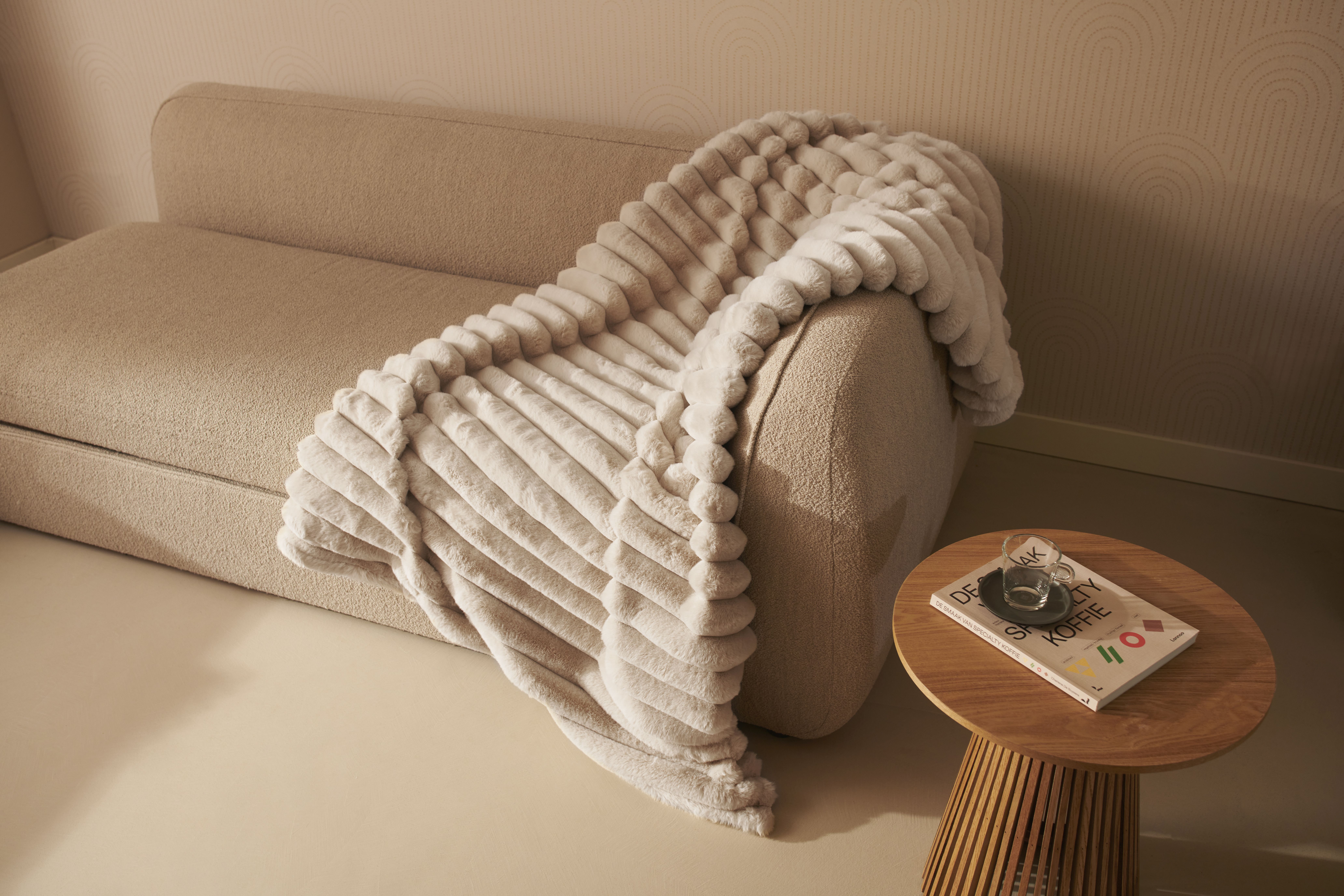 Neodolatelně hebká. Yentl je stejně hebká, jak vypadá. Vrchní vrstva z kvalitní umělé kožešiny je dostupná ve dvou vzorech (bublinky nebo proužky) a dvou elegantních barvách: béžové a šedé. Jemná a prodyšná na dotek, je ideální pro útulné večery na gauči.