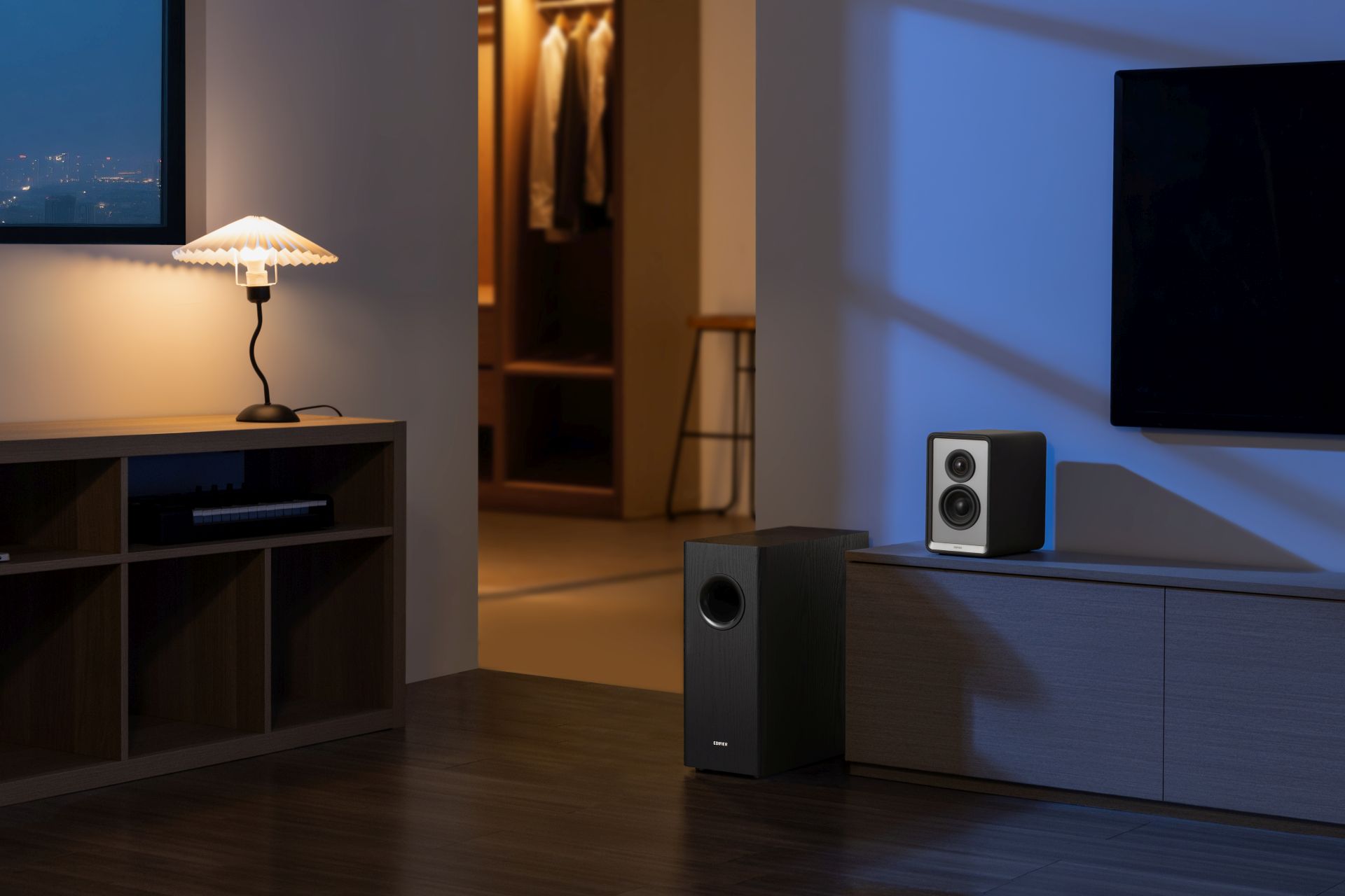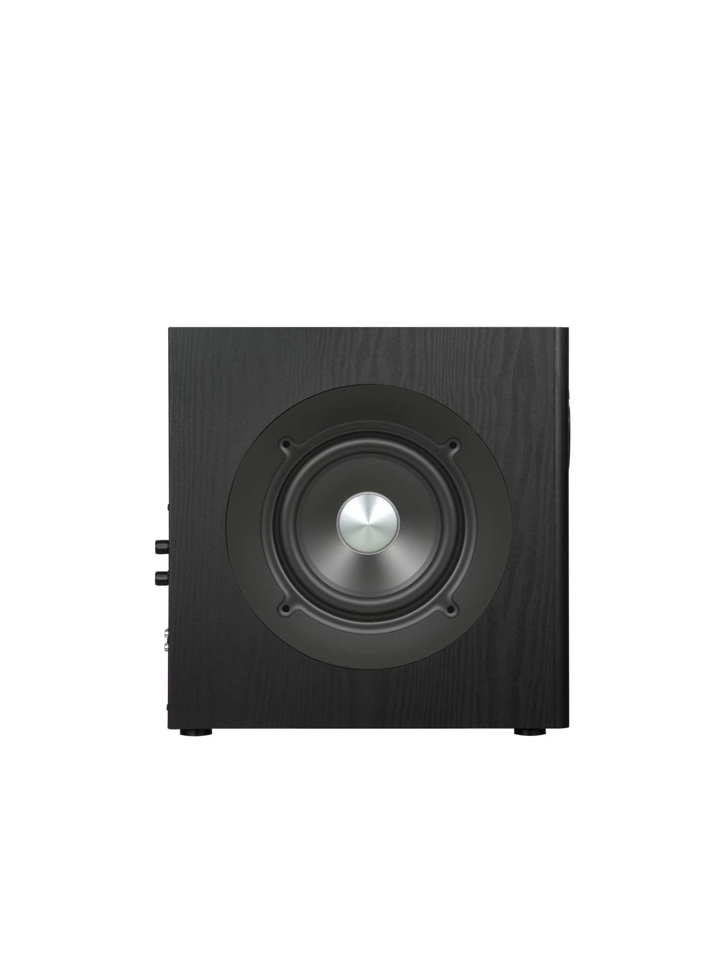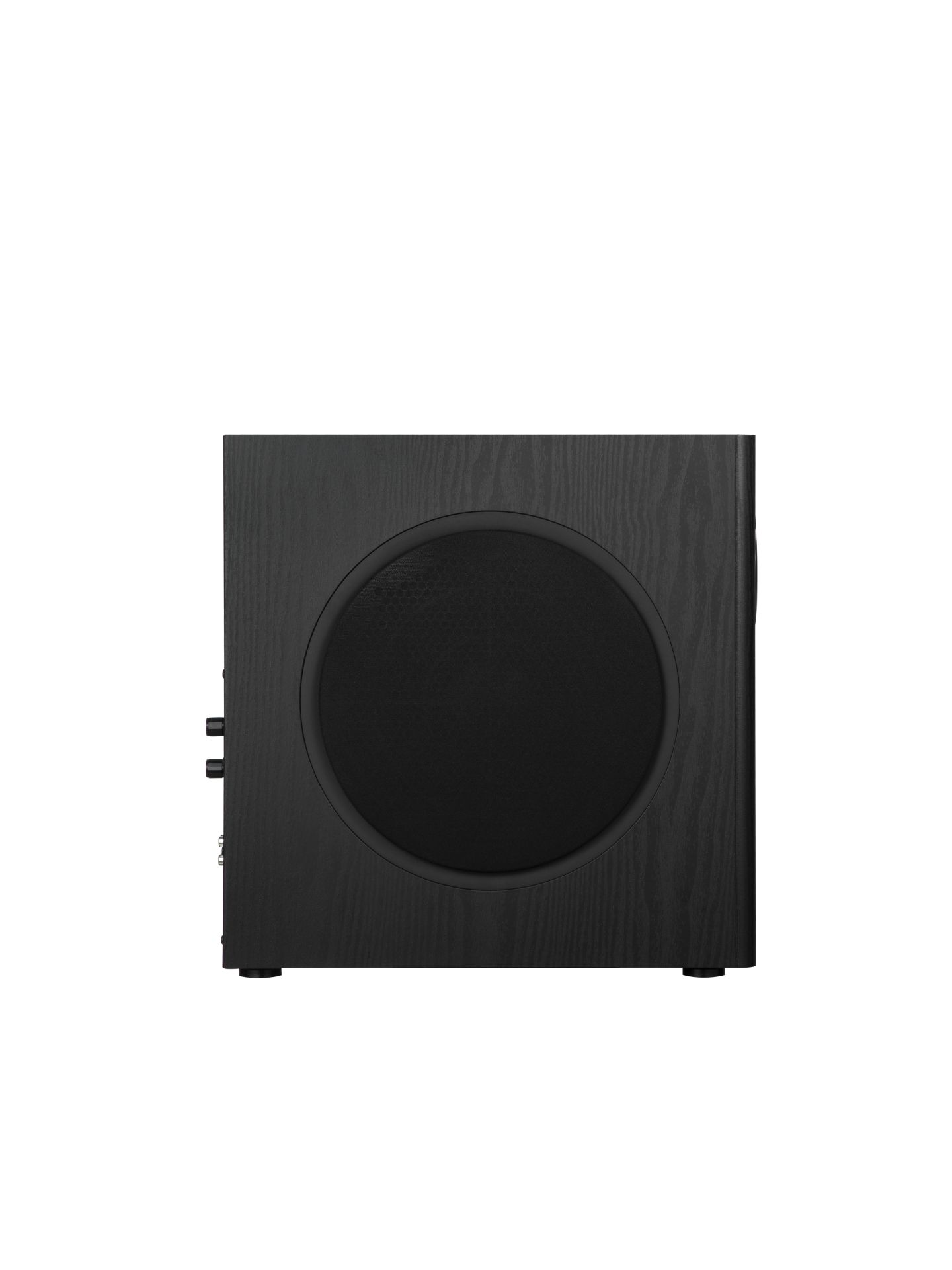 Subwoofer má povrchovou úpravu s texturou dřeva a nízkoprofilovou mřížku, díky čemuž se snadno začlení do jakéhokoli interiéru. Jeho štíhlý vertikální design umožňuje flexibilní umístění i ve stísněných nebo atypických prostorách, kde by se běžný subwoofer nevešel.