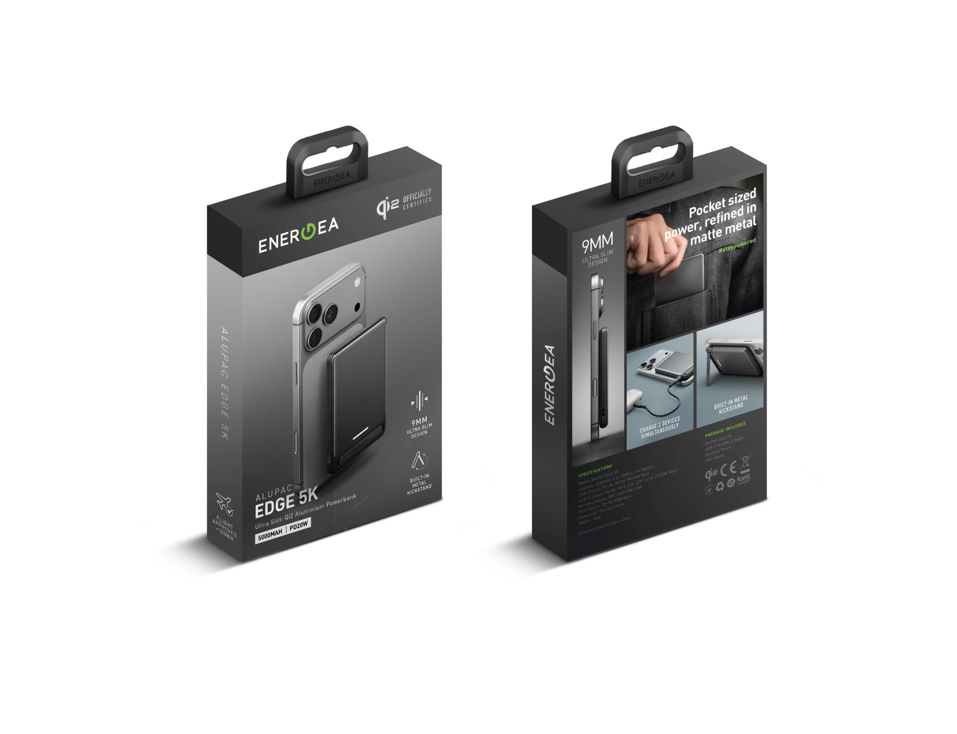 ENERGEA AluPac Edge 5K se může pochlubit ultra tenkým a prémiovým kovovým tělem o tloušťce pouhých 9 mm. Vestavěný stojánek vám umožní pohodlně sledovat videa nebo chatovat s přáteli, aniž byste museli telefon držet v ruce. Stojánek umožňuje naklápění telefonu jak do horizontální, tak do vertikální polohy, takže si můžete vychutnat své oblíbené obsahy přesně tak, jak chcete.