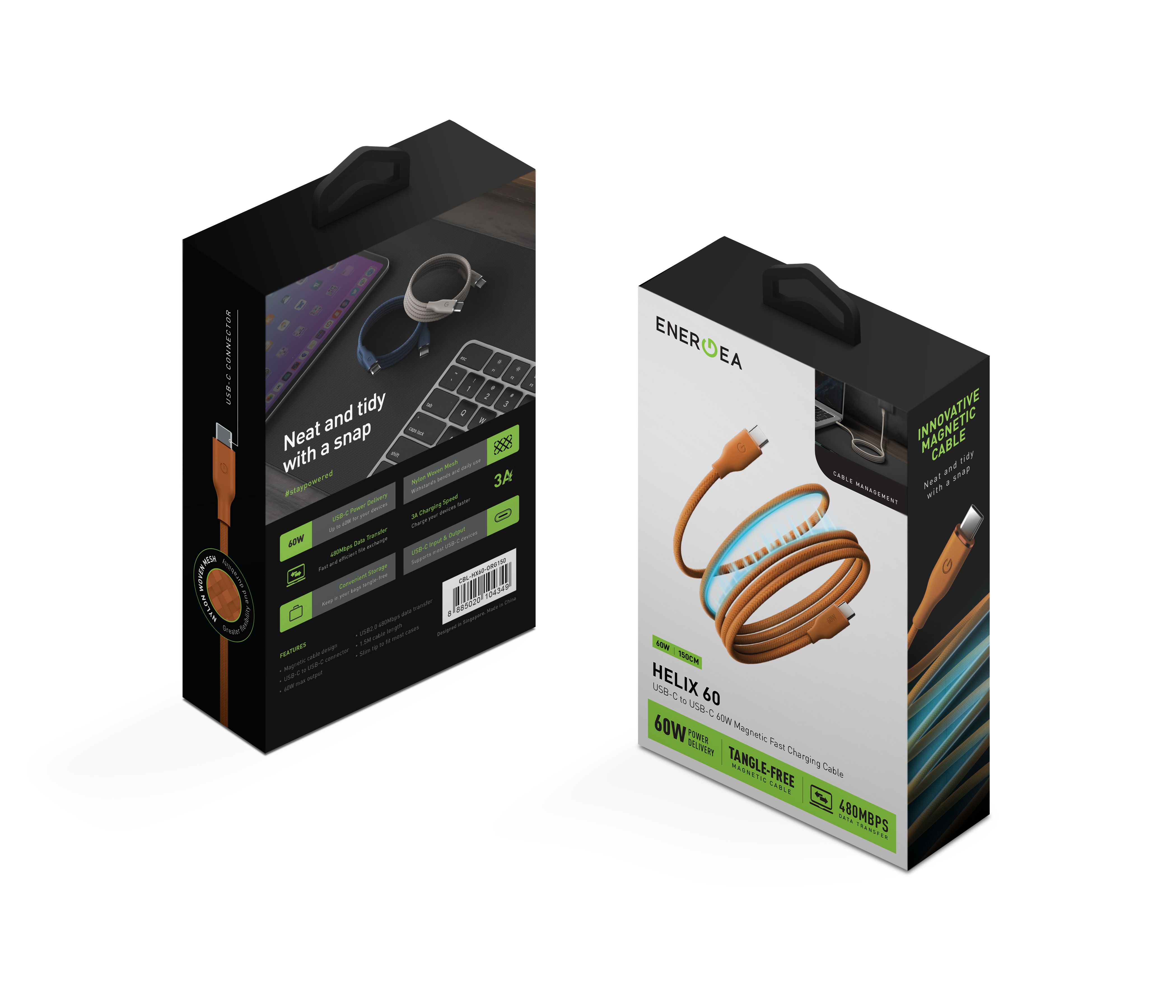 ENERGEA Helix 60 magnetický rychlonabíjecí kabel USB-C na USB-C (60 W), Orange