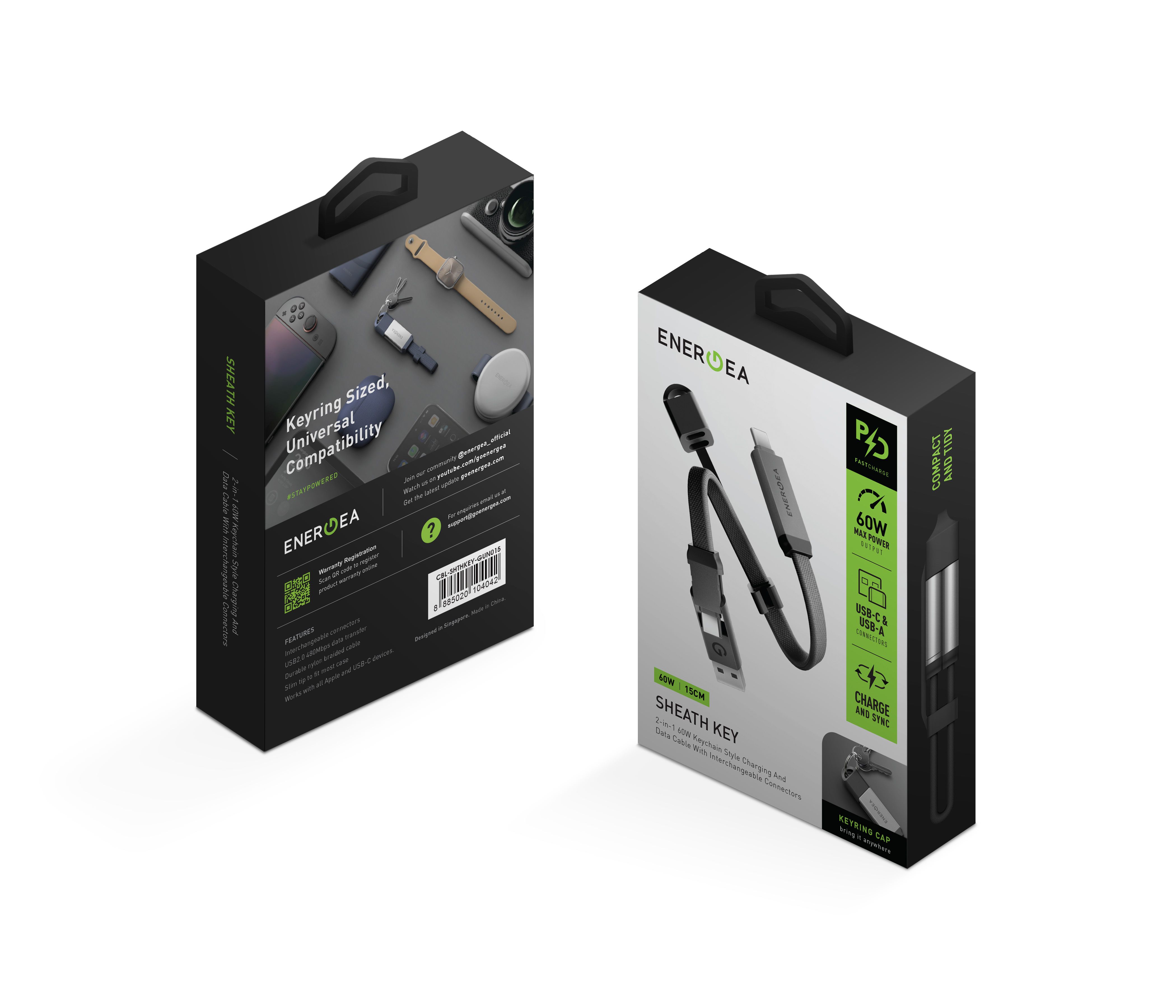Představujeme vám SHEATH KEY – kompaktní nabíjecí a datový kabel 2v1 s maximálním výkonem 60 W, navržený tak, abyste ho mohli mít vždy po ruce. Díky provedení ve stylu přívěsku na klíče, vyměnitelným konektorům a odolným materiálům je ideálním řešením pro každodenní používání, cestování i práci na cestách. Jeden kabel, mnoho možností – bez zbytečného nepořádku.