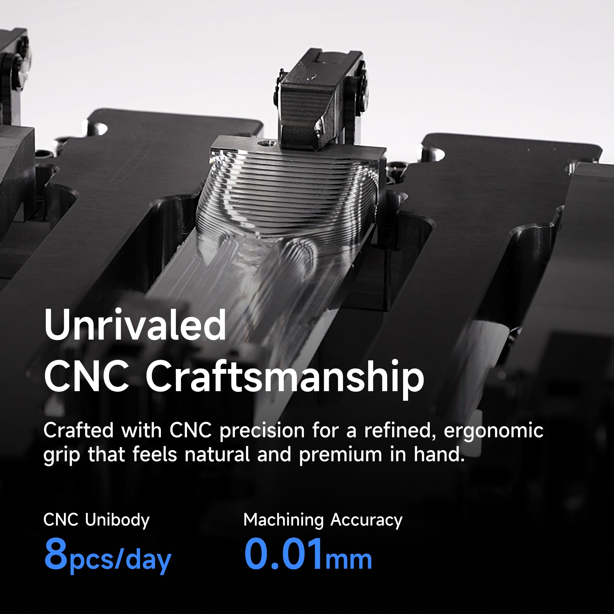 - Tělo z letecké hliníkové slitiny – odolné, lehké a elegantní. Precizní CNC obrábění s tolerancí 0,01 mm – každý detail je promyšlený.
