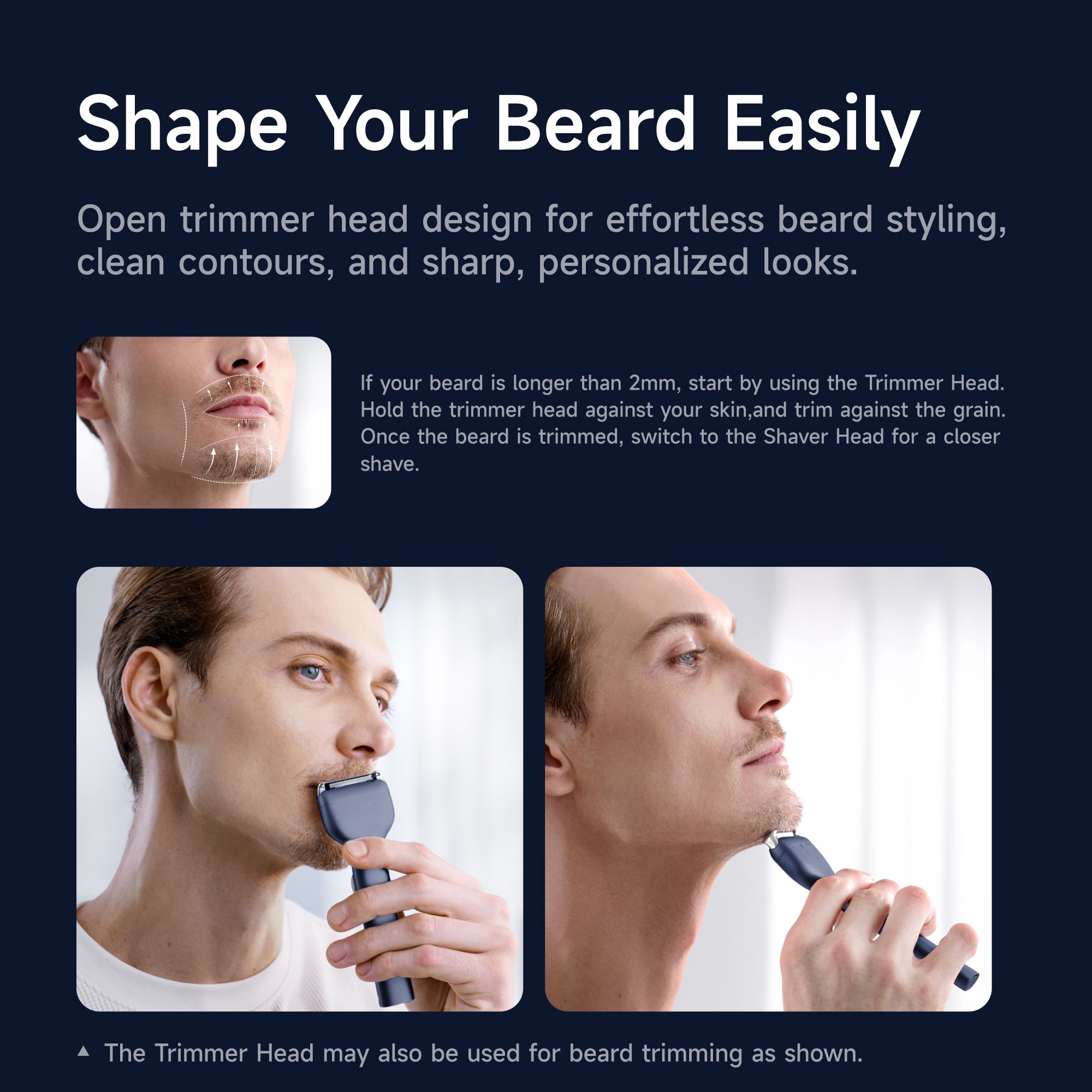 - Integrovaný zastřihovač a 3 nástavce (2 mm, 3 mm, 5 mm) – upravíte knír, bradu i kontury přesně podle svých představ.