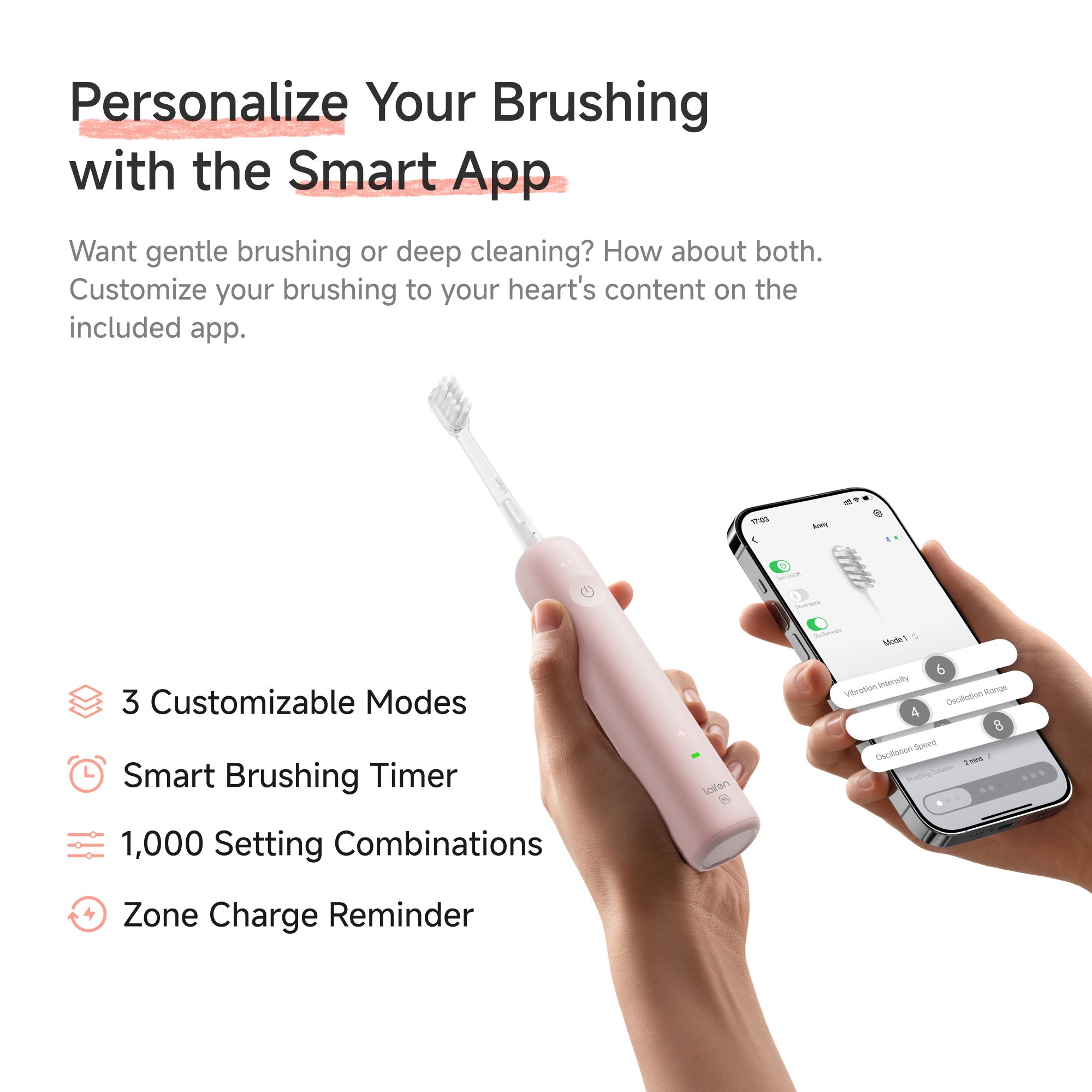 Aplikace Laifen umožňuje vytvořit více než 1 000 kombinací režimů, nastavit intenzitu, délku čištění, intervaly i cestovní režim – vše přesně podle vašich potřeb.