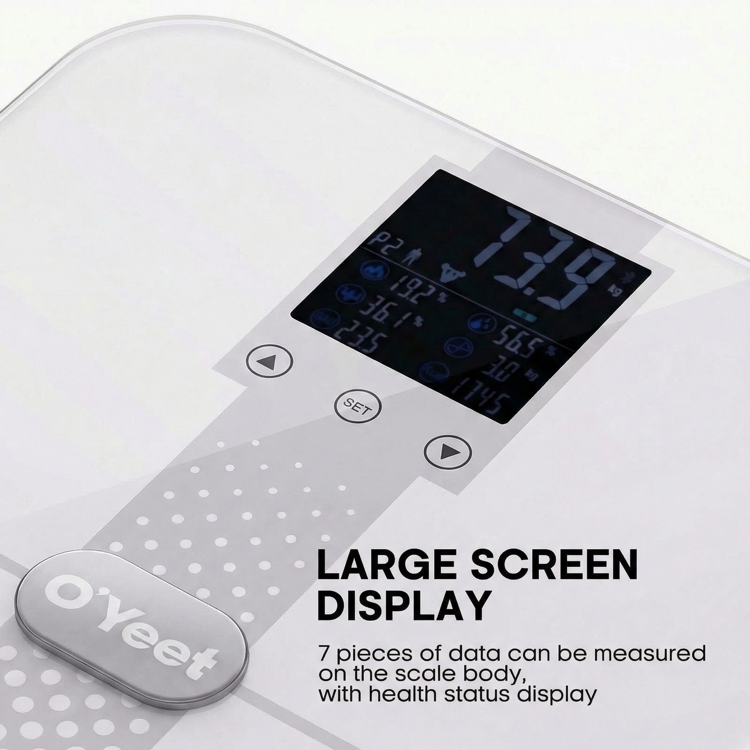 Přehledný displej – Velký LCD displej (71 x 72,5 mm) zobrazí až 7 klíčových údajů přímo na váze bez nutnosti použití telefonu, včetně základního přehledu zdravotního stavu.
