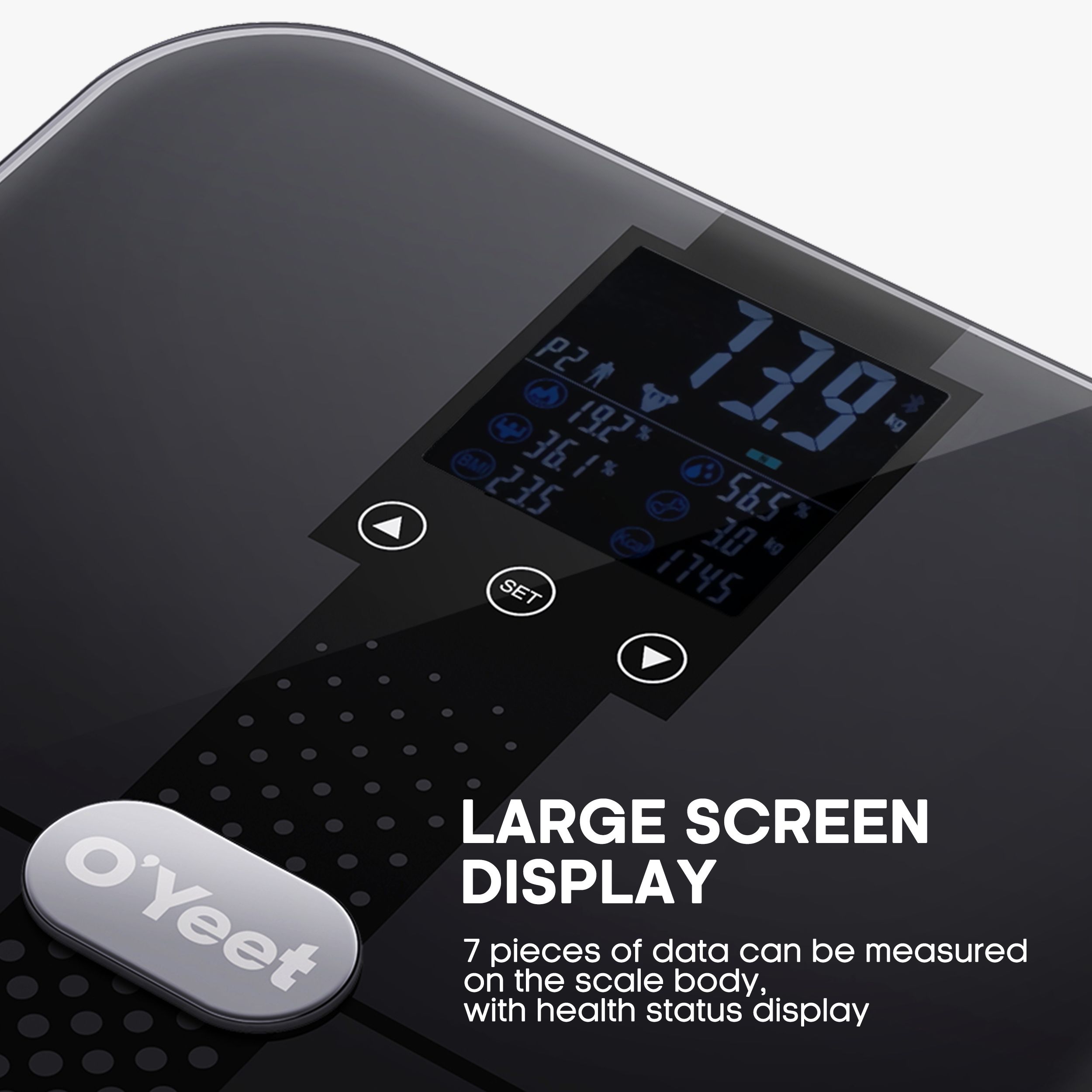 Přehledný displej – Velký LCD displej (71 x 72,5 mm) zobrazí až 7 klíčových údajů přímo na váze bez nutnosti použití telefonu, včetně základního přehledu zdravotního stavu.