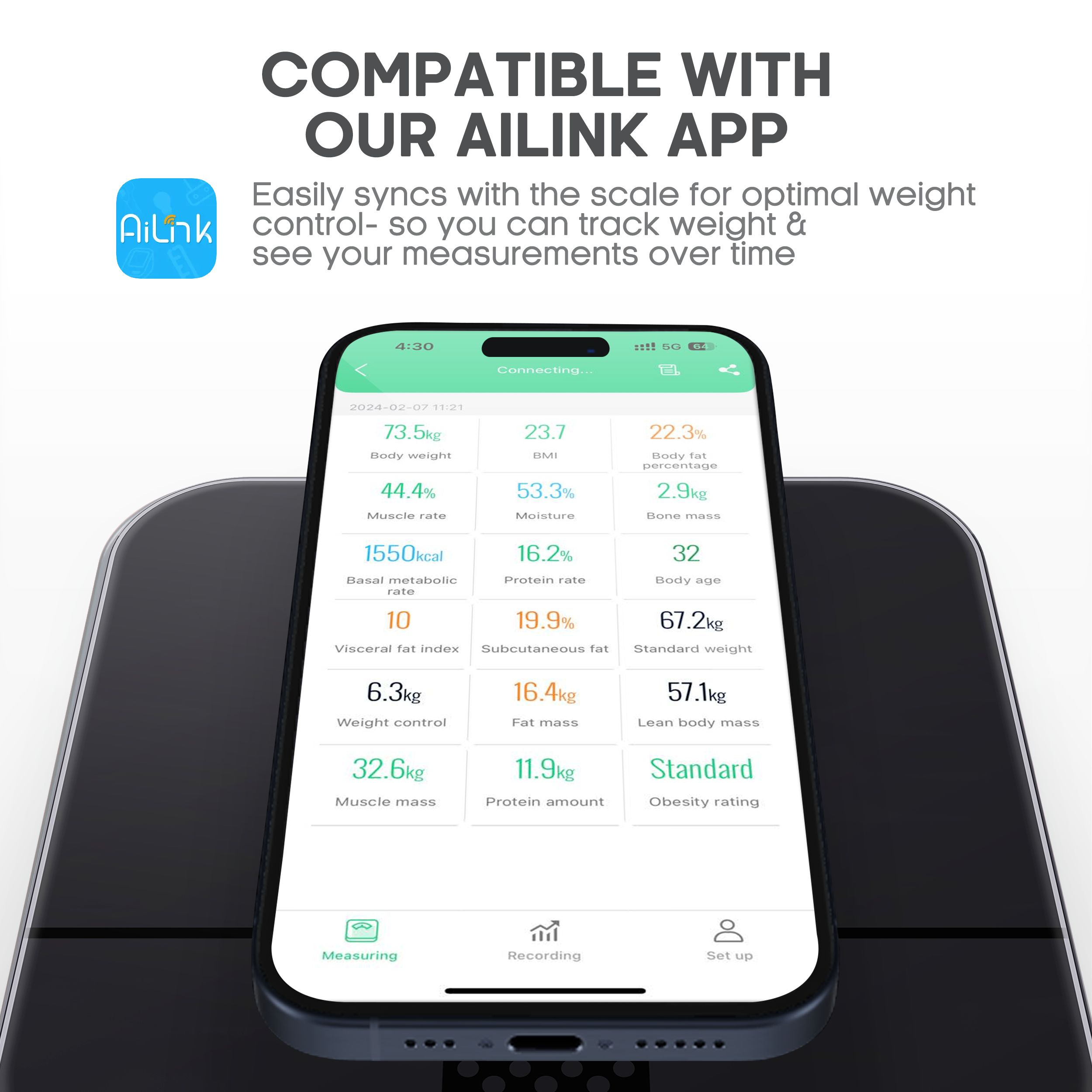 Sledování zdraví v aplikaci – Propojení přes Bluetooth s aplikací AiLink umožňuje sledovat vývoj vašich hodno. Snadno se synchronizuje s váhou pro optimální kontrolu hmotnosti. Můžete tak sledovat vývoj své váhy a prohlížet si historii měření v průběhu času.