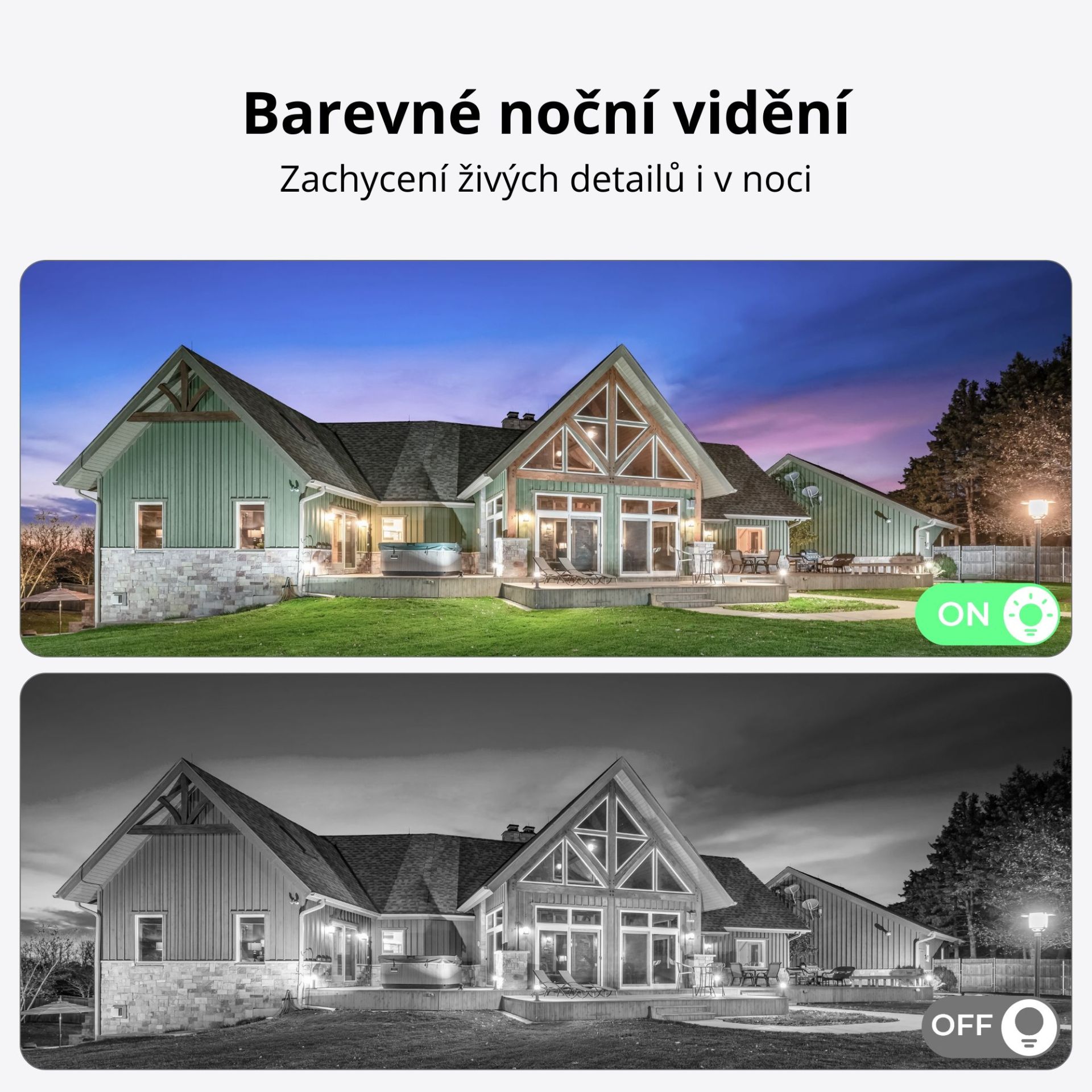 Kamera je vybavena vestavěnými reflektory a sirénou, které účinně odstrašují vetřelce. Při detekci podezřelé aktivity se aktivují reflektory, aby odradily zločince, zatímco siréna poskytuje alarmující upozornění.