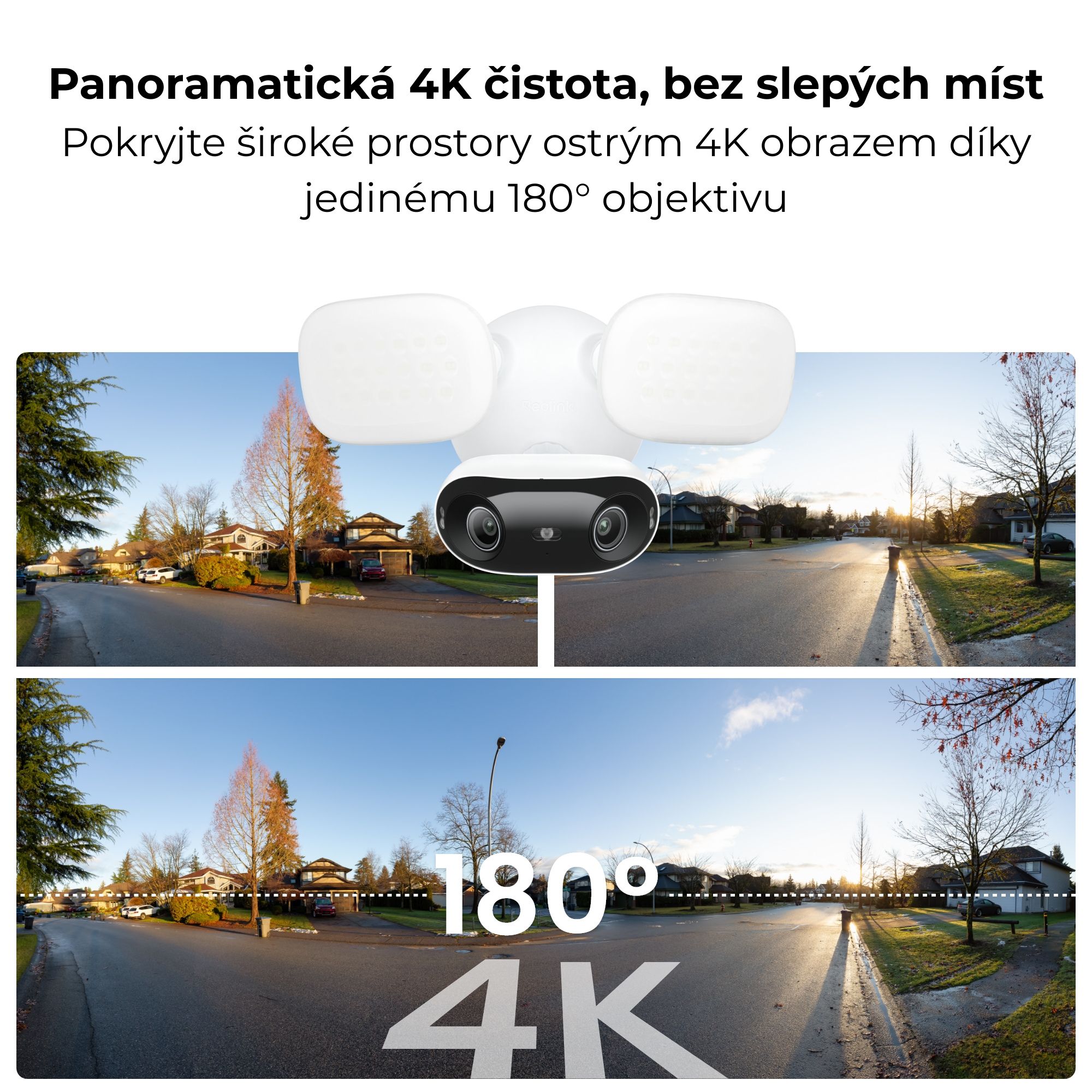 4K 8MP floodlight kamera s ultraširokým 180° záběrem, výkonnými LED reflektory až 3000 lm, AI detekcí osob, vozidel a zvířat, barevným i infra nočním…