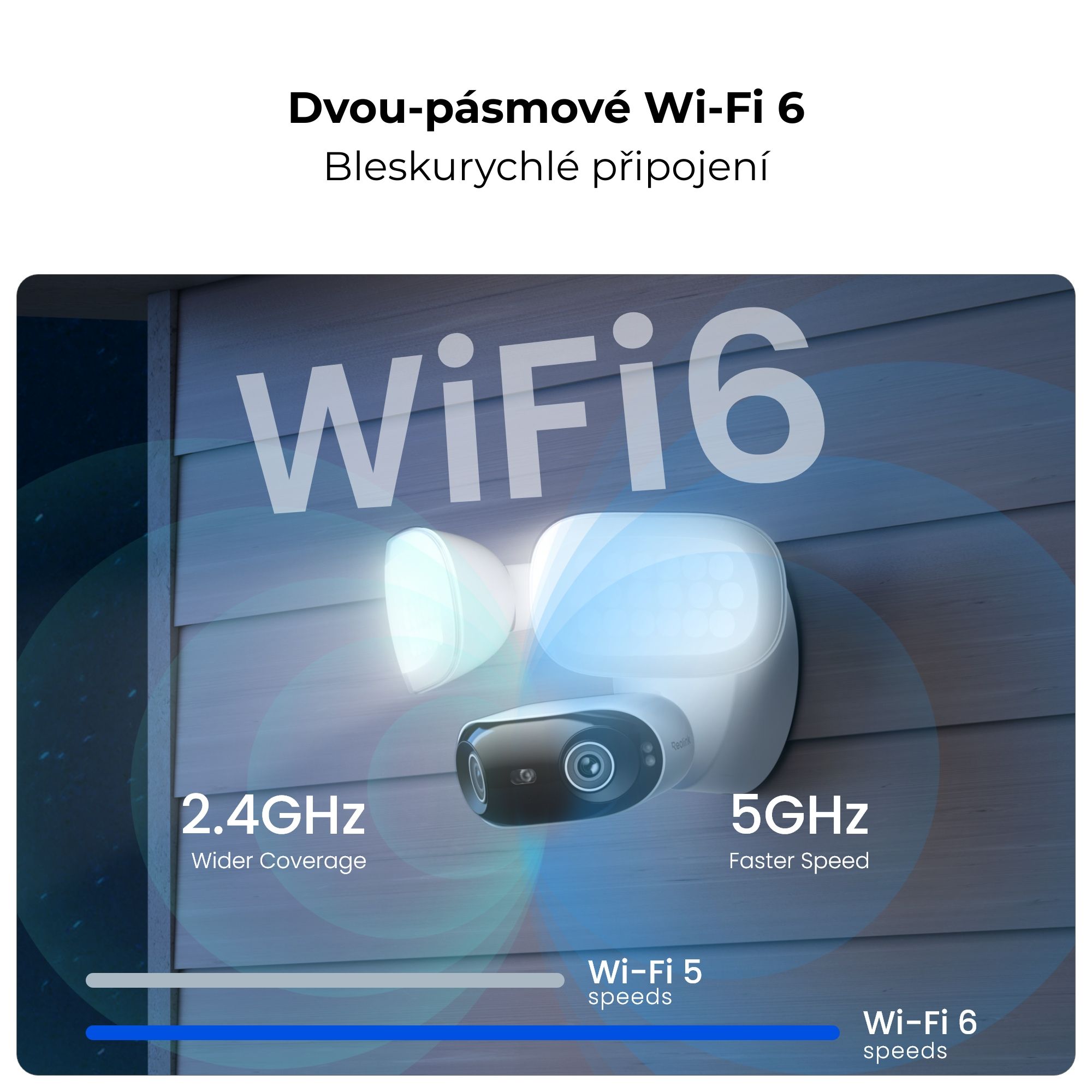 Díky Wi-Fi 6 a dvoupásmové technologii (2,4/5 GHz) je připojení rychlé, stabilní a bez zpoždění. Bluetooth párování umožňuje rychlé a jednoduché nastavení sítě. Pevné kabelové napájení zajišťuje spolehlivý provoz kamery.