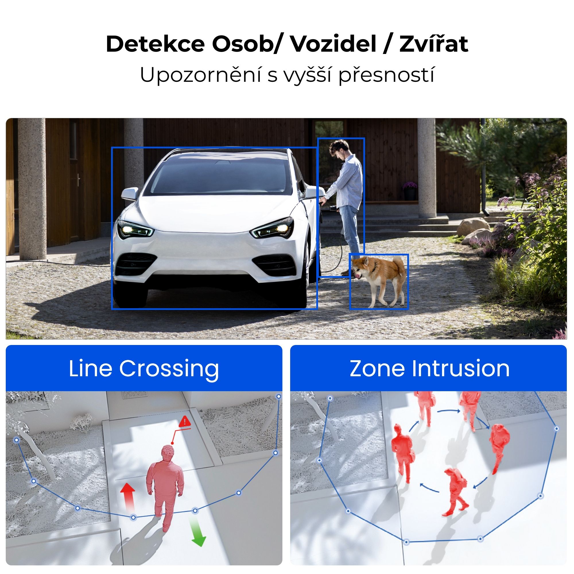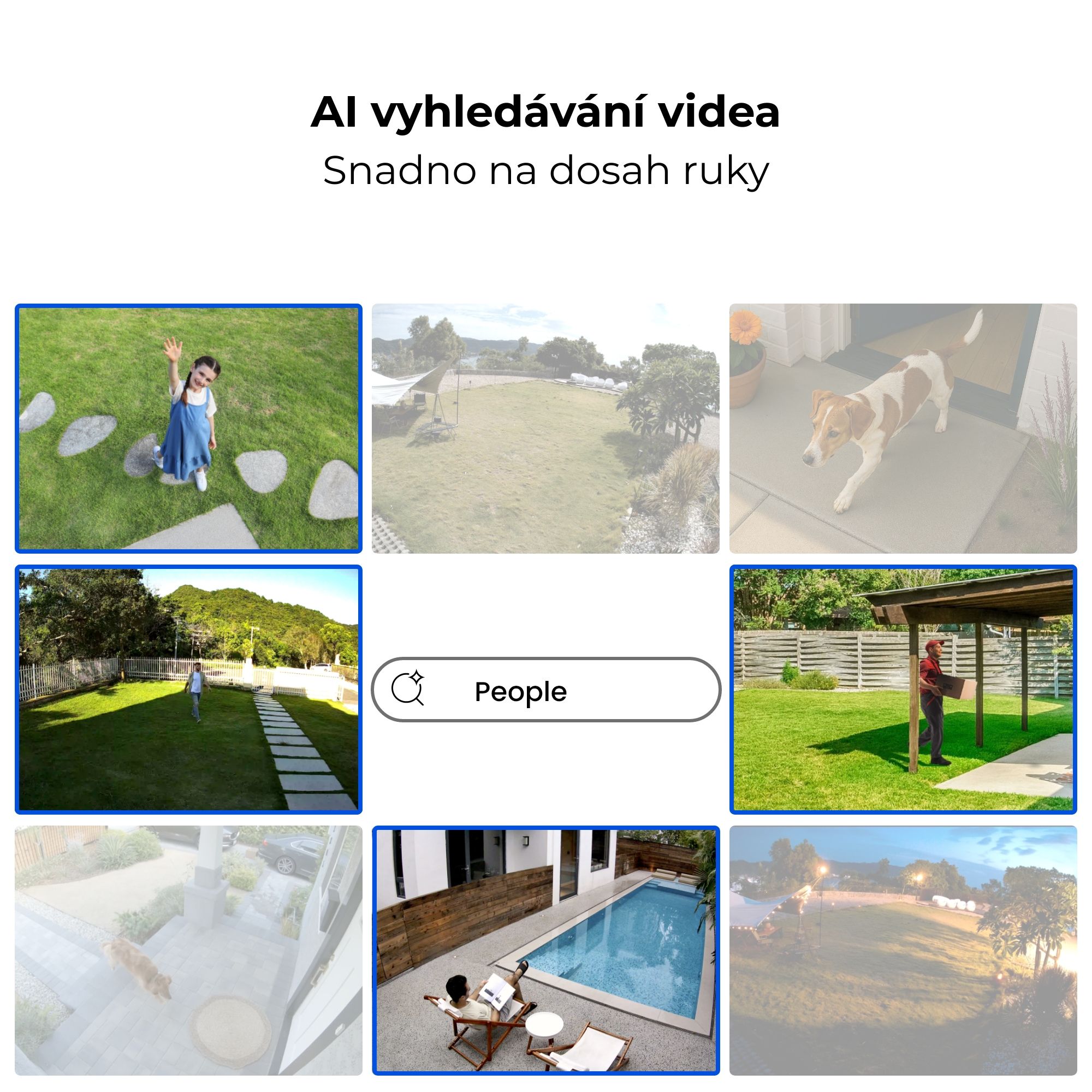 AI detekce: osoba, vozidlo, zvíře, virtuální plot, narušení zóny, zdržování v zóně, AI Video Search