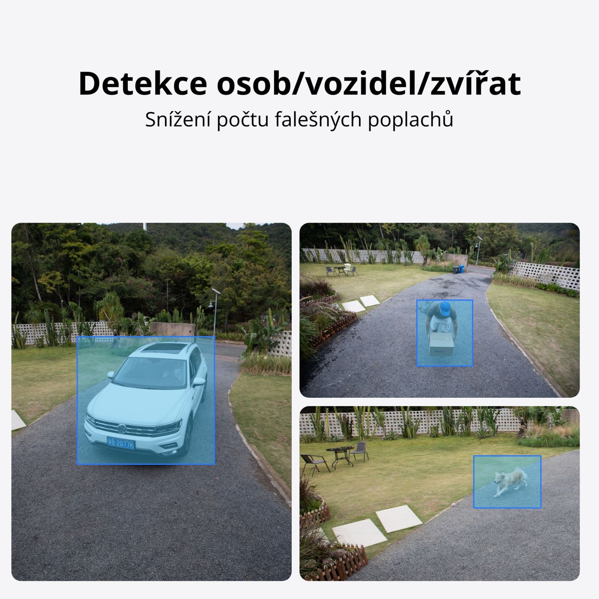 Detekce pohybu, osob, automobilů a zvířat.