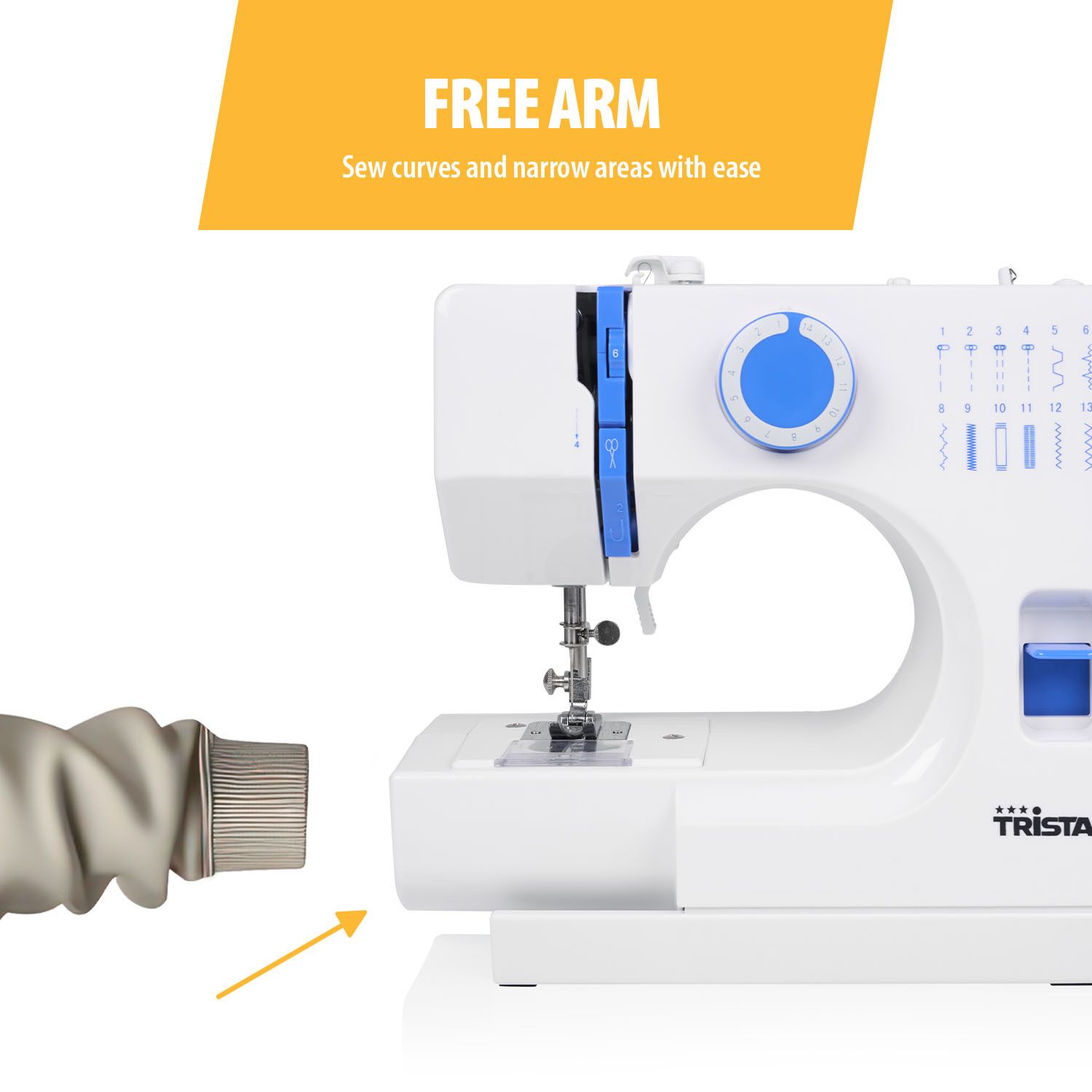 Díky volnému ramenu snadno a pohodlně ušijete i těžko dostupná místa, jako jsou rukávy, nohavice nebo manžety. Už žádné krkolomné otáčení látky!