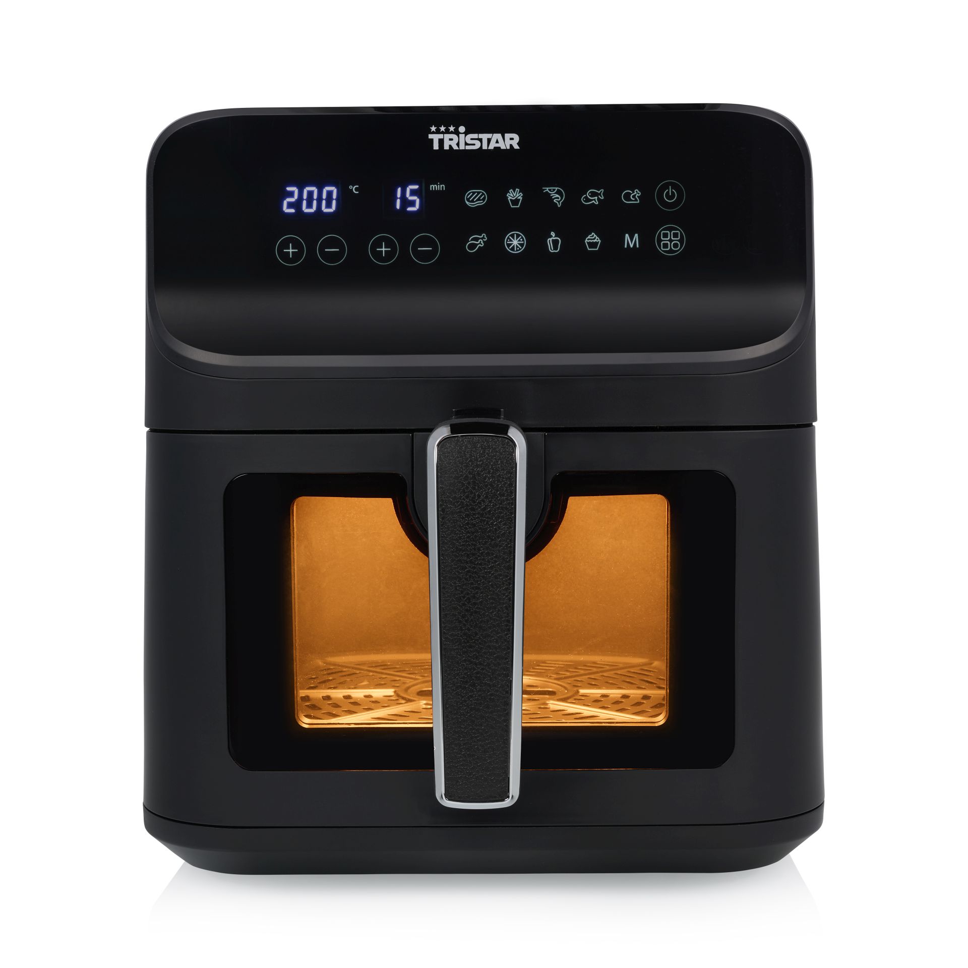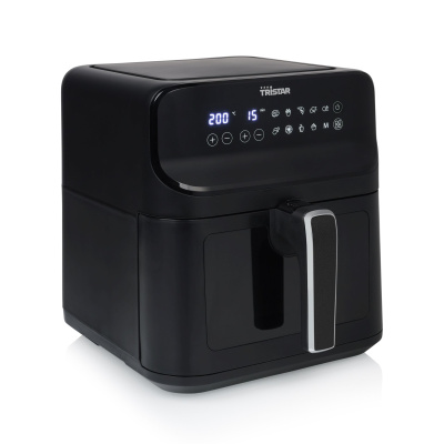 Horkovzdušná fritéza Tristar FR-9037 s digitálním dotykovým ovládacím panelem a okénkem.
